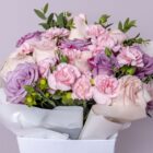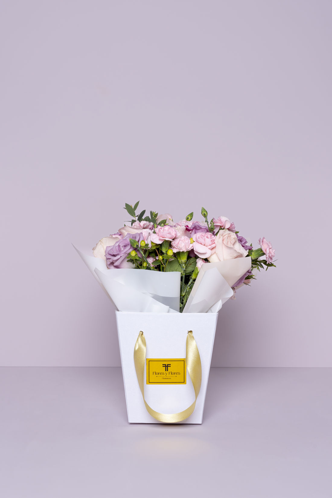 Elegante bolso floral, con una armoniosa selección de flores de temporada en tonos suaves y femeninos. Perfecto para sorprender, incluye tarjeta personalizada y recomendaciones de cuidado.