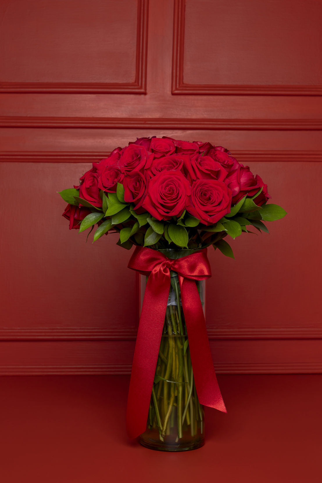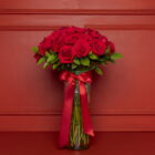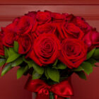 Arreglo floral compuesto por 50 rosas rojas premium, cuidadosamente seleccionadas y acompañadas de follajes de temporada, dispuestas en un florero de cristal con un delicado lazo decorativo que realza su belleza natural. Incluye tarjeta personalizada y cuidados del arreglo floral, para conservar la frescura y el encanto de las rosas por más tiempo.