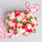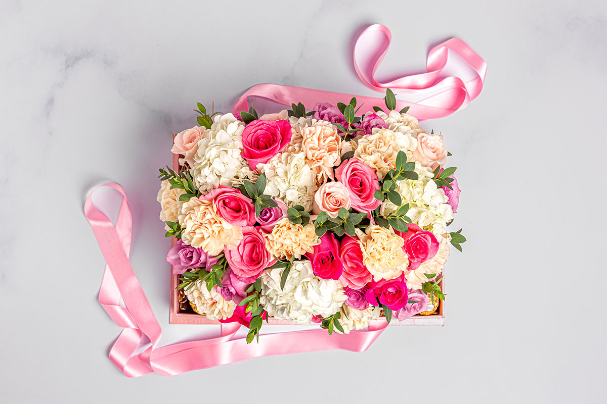 Hermoso arreglo floral de rosas y hortensias, con follajes de temporada perfecto para sorprender, con chocolates ferreros. Incluye tarjeta personalizada y cuidados del arreglo floral.